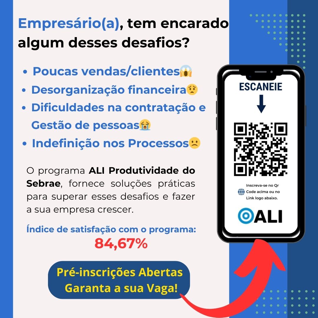 Empresário(a), o que te impede de crescer hoje? Quais são seus maiores desafios para fazer a sua empresa crescer? O ALI produtividade as soluções que a sua empresa precisa para resolver diversos desafios nas áreas de marketing, vendas, finanças, processos e pessoal, incluindo contratações e gestão de pessoas.